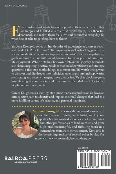 Every professional wants to reach a point in their career where they are happy and fulfilled in a role that excites them, uses their full potential, and makes them feel alive and connected every day. So what does it take to get from here to there? Yardena Krongold relies on her decades of experience as a career coach and head of HR for Fortune 500 companies as well as her long practice of ancient meditation techniques to provide professionals with a step-by-step guide on how to attain fulfillment, financial freedom, peace of mind, and life enjoyment. While detailing her own professional journey, Krongold also shares inspiring, practical wisdom that includes reflective and strategic questions, a five-step methodology to a career and life worth living, ways to discover and dig deeper into individual talents and strengths, powerful positioning and career strategies, three pitfalls in CVs that block progress, interviewing tips and tricks, and much more. Included are links to two helpful online assessments. Career Enlighten is a step-by-step guide that leads professionals down an introspective path to identify and implement small changes that lead to a more fulfilling career, life balance, and personal happiness.