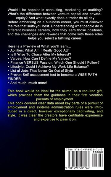 Would I be happier in consulting, marketing, or auditing? What's the difference between venture capital and private-equity? And what exactly does a trader do all day Before embarking on a business career, you must discover the role that suits you best. Understanding what people do in different business careers, how they earn those positions, and the challenges and rewards that come with those roles helps you select a fulfilling career. Here Is a Preview of What you'll learn...Abilities: What Am I Really Good At? Is It Wise To Chase After My Interest? Values: How Can I Define My Values? Finance VERSUS Passion: Which One Should I Follow? Lifestyle: Could I Achieve My Work-Life Balance? List of Jobs That Never Go Out of Style Proven Self-assessment test to become a WISE PATHFINDER And much, much more! This book would be ideal for the alumni as a required gift, which provides them the guidance in their first vocation pursuits of employment. This book covered clear data about key parts of a pursuit of employment and systems administration rules were introduced in a direct, however exceptionally captivating, and style. It was clear the creators have certifiable experience and expertise to pass it on.