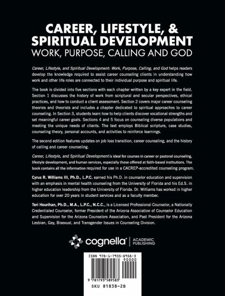 Career, Lifestyle, and Spiritual Development: Work, Purpose, Calling, and God helps readers develop the knowledge required to assist career counseling clients in understanding how work and other life roles are connected to their individual purpose and spiritual life. The book is divided into five sections with each chapter written by a key expert in the field. Section 1 discusses the history of work from scriptural and secular perspectives, ethical practices, and how to conduct a client assessment. Section 2 covers major career counseling theories and theorists and includes a chapter dedicated to spiritual approaches to career counseling. In Section 3, students learn how to help clients discover vocational strengths and set meaningful career goals. Sections 4 and 5 focus on counseling diverse populations and meeting the unique needs of clients. The text employs Biblical scripture, case studies, counseling theory, personal accounts, and activities to reinforce learnings. The second edition features updates on job loss transition, career counseling, and the history of calling and career counseling. Career, Lifestyle, and Spiritual Development is ideal for courses in career or pastoral counseling, lifestyle development, and human services, especially those offered at faith-based institutions. The book contains all the information required for use in a CACREP-accredited counseling program.