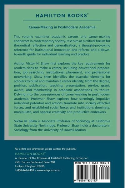 Chapter 1 Introduction Chapter 2 Part I: Career-Making in Postmodern Academia: The Process: Educational Preparation and Fulfillment Job Search and Change Institutional Affiliation and Identification Professional Networking and Recognition The Academic Career Pathway Chapter 3 Part II: Career-Making in Postmodern Academia: The Structure: Scholarly Identity The Degree Position Publication Teaching Presentation Service Grant Award Membership in Academic Associations Tenure Chapter 4 Part III: Career-Making in Postmodern Academia: The Consequence: Demands on Individuals Production, Maintenance, and Expansion of Social Authority Constraints on Choice and Individuality Chapter 5 Conclusion Chapter 6 References Chapter 7 Index