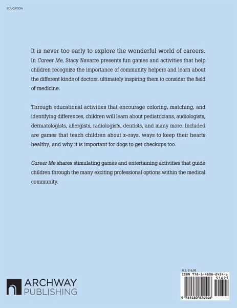 It is never too early to explore the wonderful world of careers. In Career Me, Stacy Navarre presents fun games and activities that help children recognize the importance of community helpers and learn about the different kinds of doctors, ultimately inspiring them to consider the field of medicine. Through educational activities that encourage coloring, matching, and identifying differences, children will learn about pediatricians, audiologists, dermatologists, allergists, radiologists, dentists, and many more. Included are games that teach children about x-rays, ways to keep their hearts healthy, and why it is important for dogs to get checkups too. Career Me shares stimulating games and entertaining activities that guide children through the many exciting professional options within the medical community.