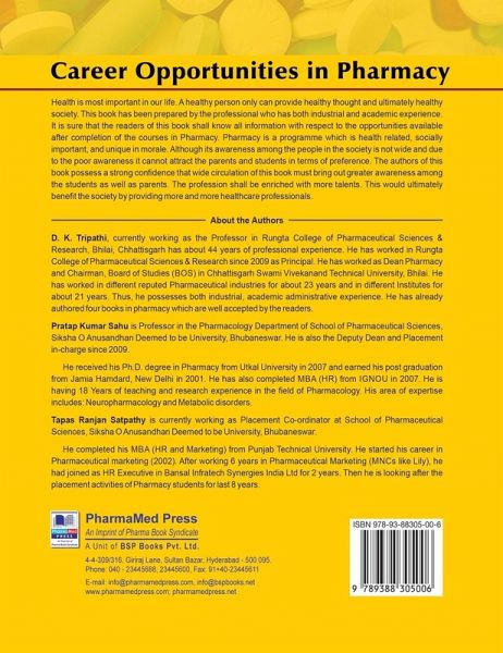 Health is most important in our life. A healthy person only can provide healthy thought and ultimately healthy society. This book has been prepared by the professional who has both industrial and academic experience. It is sure that the readers of this book shall know all information with respect to the opportunities available after completion of the courses in Pharmacy. Pharmacy is a programme which is health related, socially important, and unique in morale. Although its awareness among the people in the society is not wide and due to the poor awareness it cannot attract the parents and students in terms of preference. The authors of this book possess a strong confidence that wide circulation of this book must bring out greater awareness among the students as well as parents. The profession shall be enriched with more talents. This would ultimately benefit the society by providing more and more healthcare professionals.