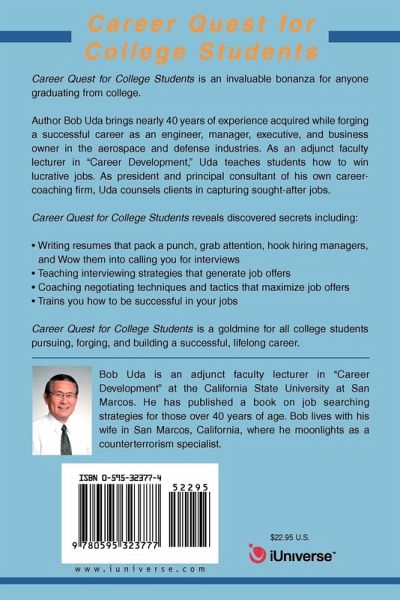 Career Quest for College Students is an invaluable bonanza for anyone graduating from college. Author Bob Uda brings nearly 40 years of experience acquired while forging a successful career as an engineer, manager, executive, and business owner in the aerospace and defense industries. As an adjunct faculty lecturer in "Career Development," Uda teaches students how to win lucrative jobs. As president and principal consultant of his own career-coaching firm, Uda counsels clients in capturing sought-after jobs. Career Quest for College Students reveals discovered secrets including: Writing resumes that pack a punch, grab attention, hook hiring managers, and Wow them into calling you for interviews Teaching interviewing strategies that generate job offers Coaching negotiating techniques and tactics that maximize job offers Trains you how to be successful in your jobs Career Quest for College Students is a goldmine for all college students pursuing, forging, and building a successful, lifelong career.