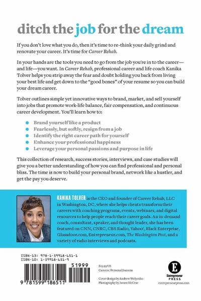 Ditch the Job for the Dream If you don't love what you do, then it's time to re-think your daily grind and renovate your career. It's time for Career Rehab. This book has the tools you need to go from the job you're in to the career-and the life-you want. In Career Rehab, professional career and life coach Kanika Tolver helps you strip away the fear and doubt holding you back from living your best life and get down to the "good bones" of your resume so you can build your dream career. Tolver outlines simple yet innovative ways to brand, market, and sell yourself into jobs that promote work-life balance, fair compensation, and continuous career development. You'll learn how to: * Brand yourself like a product * Fearlessly, but softly, resign from a job * Identify the right career path for yourself * Enhance your professional happiness * Leverage your personal passions and purpose in life This collection of research, success stories, interviews, and case studies will give you a better understanding of how you can find professional and personal bliss. The time is NOW to build your personal brand, network like a hustler, and get the pay you deserve. About the Author KANIKA TOLVER is the CEO and founder of Career Rehab, LLC in Washington, DC, where she helps clients transform their careers with coaching programs, events, webinars, and digital resources to help people reach their career goals. An in-demand coach, consultant, speaker, and thought leader, she has been featured on CNN, CNBC, CBS Radio, Yahoo!, Black Enterprise, Glassdoor.com, Entrepreneur.com, The Washington Post, and a variety of radio interviews and podcasts.
