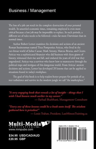 The loss of a job can result in the complete destruction of your personal wealth. In unsettled economic times, remaining employed is even more critical because a lost job may be impossible to replace. In such periods, a different set of rules needs to be followed-rules far more Darwinian than in normal times. Author Robert Lerner examines the decisions and actions of an ancient Roman businessman named Titus Pomponius Atticus, who lived in the cut-throat world of Julius Caesar, Mark Antony, Marcus Brutus, and Cicero. Atticus was a sophisticated financier who did business with these giants of history, witnessed their rise and fall, and endured the years of civil war they engendered. Atticus was a survivor who knew how to manoeuvre through the political traps and intrigues of this dangerous world. From Atticus' ancient decisions and actions, Lerner has developed 20 lessons that can be applied to situations found in today's workplace. The goal of this book is to help readers better prepare for periods of career turbulence and survive in the modern jungle we call "the marketplace."