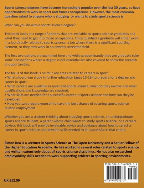 This book is aimed at students who are currently studying sports science at undergraduate level or studying BTECs in sport or sport and exercise science. The purpose of the book is to answer the big question: What do you do with a sports science degree? It is common that students know that they want to work in sport and work with people but are not sure exactly what they can do. This can affect their motivation while they study as they have no clear goal to work towards. Based on interviews with 20 people who work in sports related occupations this is designed to provide direction and guidance to enable students to make informed decisions about what they could do with their qualification. The case studies include people who work to support performance athletes, such as a sports nutritionist, sport psychologist, sports analyst, exercise physiologist and a strength and conditioning coach. Also included are cases studies of sports coaches, personal trainers and teachers as well as broader career options such as sports massage therapy, sports development and sports journalism and broadcasting. Many of the people chosen as case studies work with Olympic or professional athletes. As part of the case studies the importance of developing personal skills needed to work with athletes and other people are discussed. These discussions form the basis of a key chapter about the personal skills needed to work in sporting environments that are often unpredictable, complex and challenging. There is also important advice on how personal skills can be developed whilst studying and what else you should do during your studies to make yourself more employable. There is an introductory chapter on the options for students who want to study sports science, or similar courses, at degree level with a focus on whether A-level or BTEC qualifications will be more beneficial to them. This chapter also assesses the value of degree level study to an individual’s career. There is a concluding chapter that examines how to apply for jobs and prepare for interviews once you have gained your qualification. The author, Simon Rea, has worked as a performance coach and personal trainer as well as teaching in both higher and further education for over 25 years. He is a senior fellow of the Higher Education Academy and has written or contributed significantly to 14 books related to sports science.