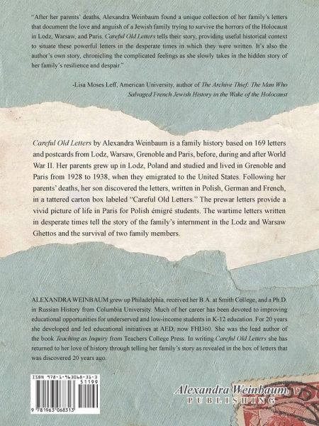 Careful Old Letters by Alexandra Weinbaum is a family history based on 169 letters and postcards from Lodz, Warsaw, Grenoble and Paris, before, during and after World War II. Her parents grew up in Lodz, Poland and studied and lived in Grenoble and Paris from 1928 to 1938, when they emigrated to the United States. Following her parents' deaths, her son discovered the letters, written in Polish, German and French, in a tattered carton box labeled "Careful Old Letters." The prewar letters provide a vivid picture of life in Paris for Polish émigré students. The wartime letters written in desperate times tell the story of the family's internment in the Lodz and Warsaw Ghettos and the survival of two family members. "After her parents' deaths, Alexandra Weinbaum found a unique collection of her family's letters that document the love and anguish of a Jewish family trying to survive the horrors of the Holocaust in Lodz, Warsaw, and Paris. Careful Old Letters tells their story, providing useful historical context to situate these powerful letters in the desperate times in which they were written. It's also the author's own story, chronicling the complicated feelings as she slowly takes in the hidden story of her family's resilience and despair." -Lisa Moses Leff, American University, author of The Archive Thief: The Man Who Salvaged French Jewish History in the Wake of the Holocaust