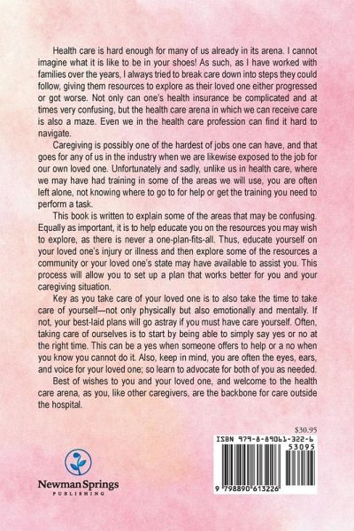 Health care is hard enough for many of us already in its arena. I cannot imagine what it is like to be in your shoes! As such, as I have worked with families over the years, I always tried to break care down into steps they could follow, giving them resources to explore as their loved one either progressed or got worse. Not only can one's health insurance be complicated and at times very confusing, but the health care arena in which we can receive care is also a maze. Even we in the health care profession can find it hard to navigate. Caregiving is possibly one of the hardest of jobs one can have, and that goes for any of us in the industry when we are likewise exposed to the job for our own loved one. Unfortunately and sadly, unlike us in health care, where we may have had training in some of the areas we will use, you are often left alone, not knowing where to go to for help or get the training you need to perform a task. This book is written to explain some of the areas that may be confusing. Equally as important, it is to help educate you on the resources you may wish to explore, as there is never a one-plan-fits-all. Thus, educate yourself on your loved one's injury or illness and then explore some of the resources a community or your loved one's state may have available to assist you. This process will allow you to set up a plan that works better for you and your caregiving situation. Key as you take care of your loved one is to also take the time to take care of yourself--not only physically but also emotionally and mentally. If not, your best-laid plans will go astray if you must have care yourself. Often, taking care of ourselves is to start by being able to simply say yes or no at the right time. This can be a yes when someone offers to help or a no when you know you cannot do it. Also, keep in mind, you are often the eyes, ears, and voice for your loved one; so learn to advocate for both of you as needed. Best of wishes to you and your loved one, and welcome to the health care arena, as you, like other caregivers, are the backbone for care outside the hospital.