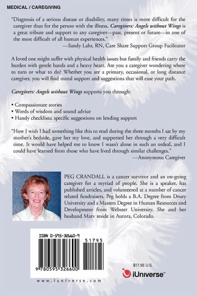 "Diagnosis of a serious disease or disability, many times is more difficult for the caregiver than for the person with the illness. Caregivers: Angels without Wings is a great tribute and support to any caregiver--past, present or future--in one of the most difficult of all human experiences." --Sandy Lahr, RN, Care Share Support Group Facilitator A loved one might suffer with physical health issues but family and friends carry the burden with gentle hands and a heavy heart. Are you a caregiver wondering where to turn or what to do? Whether you are a primary, occasional, or long distance caregiver, you will find moral support and suggestions that will ease your path. Caregivers: Angels without Wings supports you through: Compassionate stories Words of wisdom and sound advice Handy checklists: specific suggestions on lending support "How I wish I had something like this to read during the three months I sat by my mother's bedside, gave her my love, and supported her through a very difficult time. It would have helped me to know I wasn't alone in such an ordeal, and I could have learned from those who have lived through similar challenges." --Anonymous Caregiver
