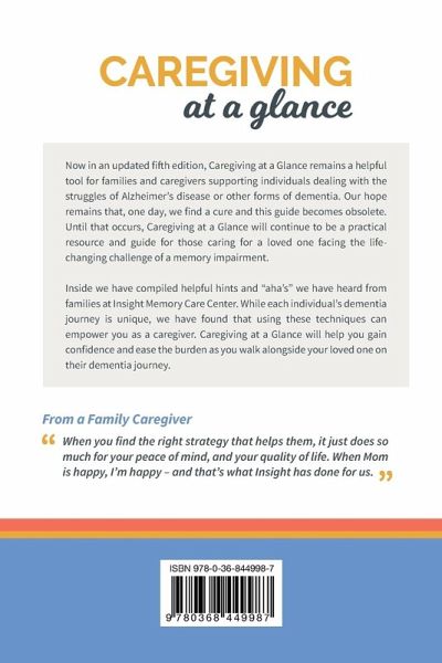 Now in an updated fifth edition, Caregiving at a Glance remains a helpful tool for families and caregivers supporting individuals dealing with the struggles of Alzheimer's disease or other forms of dementia. Our hope remains that, one day, we find a cure and this guide becomes obsolete. Until that occurs, Caregiving at a Glance will continue to be a practical resource and guide for those caring for a loved one facing the life-changing challenge of a memory impairment. Inside we have compiled helpful hints and "aha's" we have heard from families at Insight Memory Care Center. While each individual's dementia journey is unique, we have found that using these techniques can empower you as a caregiver. Caregiving at a Glance will help you gain confidence and ease the burden as you walk alongside your loved one on their dementia journey.