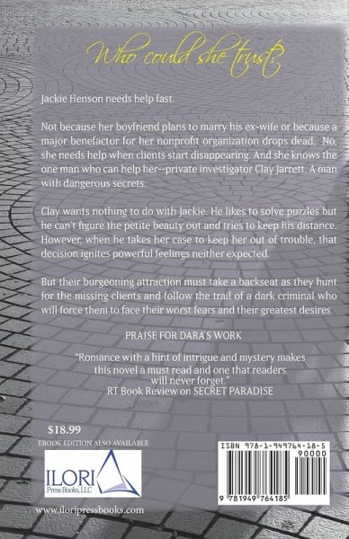 Jackie Henson needs help fast. Not because her boyfriend plans to marry his ex-wife or because a major benefactor for her nonprofit organization drops dead. No, she needs help when clients start disappearing. And she knows the one man who can help her--private investigator Clay Jarrett. A man with dangerous secrets. Clay wants nothing to do with Jackie. He likes to solve puzzles but he can't figure the petite beauty out and tries to keep his distance. However, when he takes her case to keep her out of trouble, that decision ignites powerful feelings neither expected. But their burgeoning attraction must take a backseat as they hunt for the missing clients and follow the trail of a dark criminal who will force them to face their worst fears and their greatest desires.
