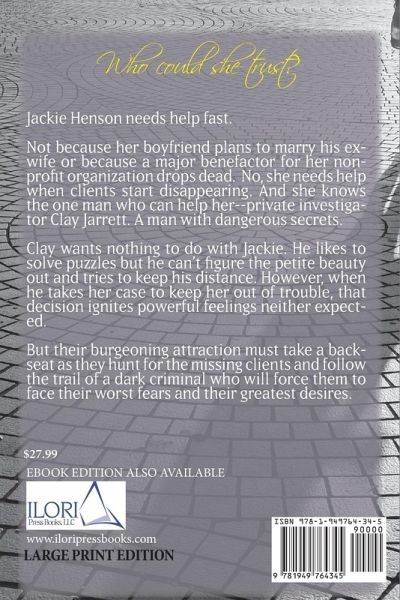 Large Print Edition Jackie Henson needs help fast. Not because her boyfriend plans to marry his ex-wife or because a major benefactor for her nonprofit organization drops dead. No, she needs help when clients start disappearing. And she knows the one man who can help her--private investigator Clay Jarrett. A man with dangerous secrets. Clay wants nothing to do with Jackie. He likes to solve puzzles but he can't figure the petite beauty out and tries to keep his distance. However, when he takes her case to keep her out of trouble, that decision ignites powerful feelings neither expected. But their burgeoning attraction must take a backseat as they hunt for the missing clients and follow the trail of a dark criminal who will force them to face their worst fears and their greatest desires.