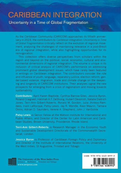 As the Caribbean Community (CARICOM) approaches its fiftieth anniversary in 2023, the contributors to Caribbean Integration: Uncertainty in Time of Global Fragmentation critically reflect on the evolution of regional movement, analysing the challenges of maintaining relevance in a post-Brexit era of regional integration, while also highlighting opportunities for its reinvigoration. This collection offers diverse perspectives from scholars within the region and beyond on the political, social, economic, cultural and environmental dimensions of regional integration. The volume is unique in its inclusion of critical analysis of CARICOM's performance on addressing prominent global development issues, which have rarely been featured in writings on Caribbean integration. The contributors consider the role and influence of youth, language, reparatory justice, election reform, gender-based violence, migration, trade and climate change on the deepening and longevity of CARICOM institutions. Their analyses signal the new prospects for emerging from a crisis of regionalism and moving towards sustainability. Contributors: April Karen Baptiste, Cynthia Barrow-Giles, Jessica Byron, Roland Craigwell, Halimah A.F. DeShong, Hubert Devonish, Natalie Dietrich Jones, Terri-Ann Gilbert-Roberts, Ronald M. Gordon, Julia Jhinkoo-Ramdass, Irwin La Rocque, Patsy Lewis, Jay R. Mandle, Alain Maurin, Tamara Onnis, Adrian D. Saunders, Verene A. Shepherd, John J. VanSickle Patsy Lewis is Senior Fellow at the Watson Institute for International and Public Affairs, and Director of the Center for Latin American and Caribbean Studies, Brown University, Providence, Rhode Island. Terri-Ann Gilbert-Roberts is Research Manager in the Economic Youth and Sustainable Development Directorate of the Commonwealth Secretariat, London. Jessica Byron is Professor of Caribbean Foreign Policy and Diplomacy and Director of the Institute of International Relations, the University of the West Indies, St Augustine, Trinidad and Tobago.