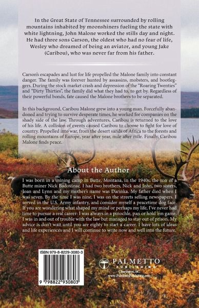 In the Great State of Tennessee surrounded by rolling mountains inhabited by moonshiners fueling the state with white lightning, John Malone worked the stills day and night. He had three sons Carson, the oldest who had no fear of life, Wesley who dreamed of being an aviator, and young Jake (Caribou), who was never far from his father. Carson's escapades and lust for life propelled the Malone family into constant danger. The family was forever hunted by assassins, mobsters, and bootleg-gers. During the stock market crash and depression of the "Roaring Twenties" and "Dirty Thirties", the family did what they had to, to get by. Regardless of their powerful bonds, fate caused the Malone brothers to be separated. In this background, Caribou Malone grew into a young man. Forcefully aban-doned and trying to survive desperate times, he worked for companies on the shady side of the law. Through adventures, Caribou is returned to the love of his life. A collision of events caused Caribou to choose to fight for love of country. Propelled into war, from the desert sands of Africa to the forests and rolling mountains of Europe, year after year, mile after mile. Finally, Caribou Malone finds peace.