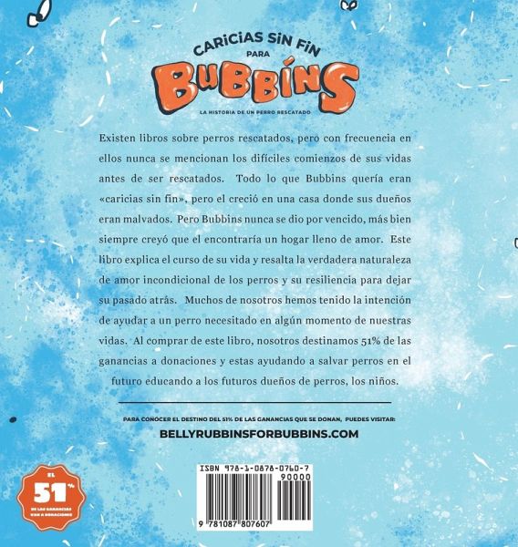 Existen libros sobre perros rescatados, pero con frecuencia en ellos nunca se mencionan los difíciles comienzos de sus vidas antes de ser rescatados. Todo lo que Bubbins quería eran «caricias sin fin», pero el creció en una casa donde sus dueños eran malvados. Pero Bubbins nunca se dio por vencido, más bien siempre creyó que el encontraría un hogar lleno de amor. Este libro explica el curso de su vida y resalta la verdadera naturaleza de amor incondicional de los perros y su resiliencia para dejar su pasado atrás. Muchos de nosotros hemos tenido la intención de ayudar a un perro necesitado en algún momento de nuestras vidas. Al comprar de este libro, nosotros destinamos 51% de las ganancias a donaciones y estas ayudando a salvar perros en el futuro educando a los futuros dueños de perros, los niños. Para obtener más información, visite www.bellyrubbinsforbubbins.com