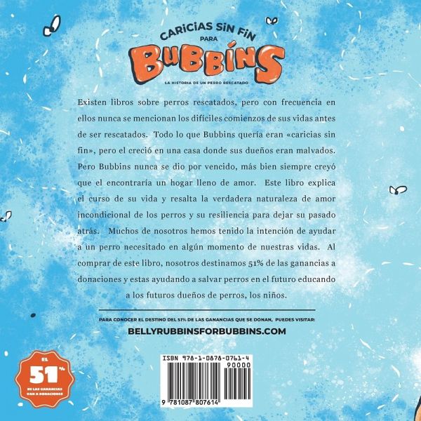 Existen libros sobre perros rescatados, pero con frecuencia en ellos nunca se mencionan los difíciles comienzos de sus vidas antes de ser rescatados. Todo lo que Bubbins quería eran «caricias sin fin», pero el creció en una casa donde sus dueños eran malvados. Pero Bubbins nunca se dio por vencido, más bien siempre creyó que el encontraría un hogar lleno de amor. Este libro explica el curso de su vida y resalta la verdadera naturaleza de amor incondicional de los perros y su resiliencia para dejar su pasado atrás. Muchos de nosotros hemos tenido la intención de ayudar a un perro necesitado en algún momento de nuestras vidas. Al comprar de este libro, nosotros destinamos 51% de las ganancias a donaciones y estas ayudando a salvar perros en el futuro educando a los futuros dueños de perros, los niños. Para obtener más información, visite www.bellyrubbinsforbubbins.com