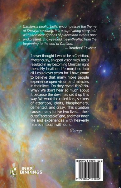Carillon, a peal of bells, encompasses the theme of Snowye's writing. It is a captivating story told with vivid descriptions of places and events past and present. Snowye held me enthralled from the beginning to the end of Carillon. -Reader's Favorite I never thought I would be a Christian. Mysteriously, an open vision with Jesus resulted in my becoming Christian right then. My heathen life morphed into all I could ever yearn for. I have come to believe that many more people experience open vision and miracles in their lives. Do they reveal this? No. Why? We don't hear so much about it because the devil has set it up this way. We would be called liars, seekers of attention, idiots, blasphemers, demented, and crazy. This situation causes many to live two lives....their outer "acceptable" one, and their inner life and experiences with heavenly hearts in touch with ours.-Snowye For more details, please visit www.carillonbook.com.