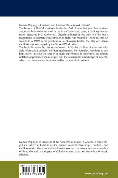 The book discusses the history and music of Gdansk carillons. It contains valuable information on bells, carillon mechanisms, bell founders, carillonists, and bell setters, inviting the reader to study the Protestant repertoire, the unique notation of preserved manuscripts, and the remarkable soundscape of Gdansk, which for centuries has been marked by the sound of carillons.