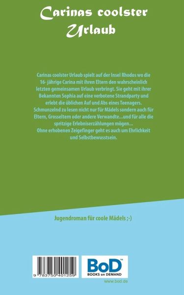 Carinas coolster Urlaub spielt auf der Insel Rhodos wo die 16-jährige Carina mit ihren Eltern den wahrscheinlich letzten gemeinsamen Familienurlaub verbringt. Sie besucht mit ihrer Bekannten Sophia eine verbotene Strandparty und erlebt die üblichen Auf und Abs eines Teenagers. Carinas und Sophias Werte und Ansichten driften stark auseinander und Carina muss lernen zu ihren Entscheidungen zu stehen. Schmunzelnd zu lesen nicht nur für (coole) Mädels sondern auch für deren Eltern, Grosseltern, Tanten und alle die gerne fröhliche Erlebniserzählungen mögen...