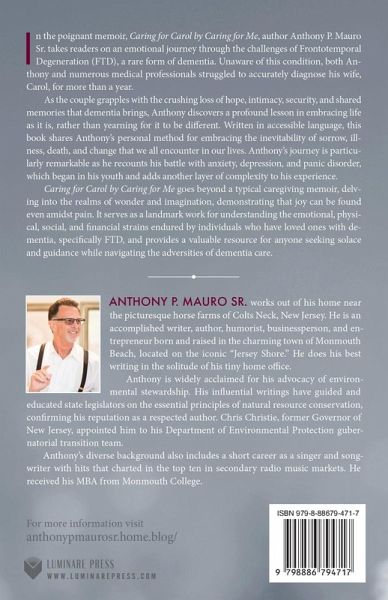 "I recommend Caring for Carol by Caring for Me as a touching and insightful guide." - Ellen Samson, authority dementia care and geriatric care management. "A powerful reflection on life with dementia and the importance of self-care." - Kirkus Reviews "This deeply personal and moving book celebrates what is left rather than mourning what is lost. Thank you, Anthony!" - Gayatri Devi, MD, MS, FAAN In the poignant memoir Caring for Carol by Caring for Me, author Anthony P. Mauro Sr. takes readers on an emotional journey through the challenges of Frontotemporal Degeneration (FTD), a rare form of dementia. Unaware of this condition, both Anthony and numerous medical professionals struggled to accurately diagnose his wife, Carol, for over a year. As Carol's health deteriorates, and the couple grapples with the crushing loss of hope, intimacy, security, and shared memories that dementia brings, Anthony discovers a profound lesson on embracing life as it is, rather than yearning for it to be different. Written in accessible language, this book shares Anthony's personal method for embracing the inevitability of sorrow, illness, death, and change that we all encounter in our lives. Anthony's journey is particularly remarkable as he recounts his battle with anxiety, depression, and panic disorder, which began in his youth and adds another layer of complexity to his tale. Caring for Carol by Caring for Me goes beyond a typical caregiving memoir; it delves into the realms of wonder and imagination, demonstrating that joy can be found even amidst pain. It serves as a landmark work for understanding the emotional, physical, social, and financial strains endured by individuals who have loved ones with dementia, specifically Frontotemporal Degeneration (FTD). This deeply moving narrative is a valuable resource for anyone seeking solace and guidance while navigating the adversities of dementia care.