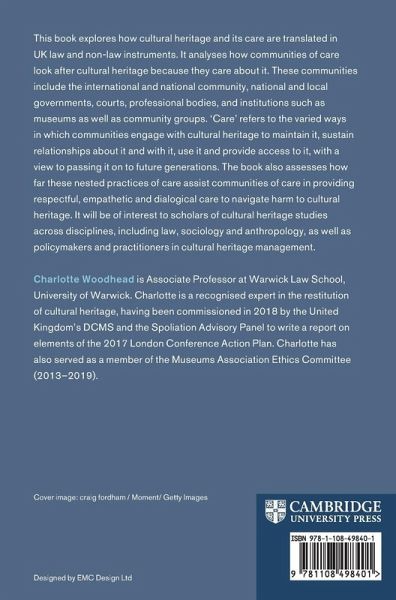 This book comprehensively analyses the UK law and non-law instruments that care for cultural heritage. Viewing the law as a community of care, working with other communities, brings new insights to our understanding of cultural heritage protection, making this book of interest to legal and heritage academics and practitioners.