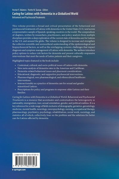 Caring for Latinxs with Dementia in a Globalized World: Behavioral and Psychosocial Treatments is a resource that accentuates and contextualizes the heterogeneity in nationality, immigration, race, sexual orientation, gender, and political realities. It is a key reference for a wide range of fields inclusive of demography, geriatrics, gerontology, medicine, mental health, neurology, neuropsychology, nursing, occupational therapy, pharmacology, psychiatry, psychology, rehabilitation, social work, sociology, and statistics all of which, collectively, bear on the problem and the solutions for better care for Latinxs affected by dementia.