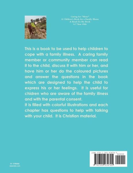 Caring for "Mme" 4-7 Years Old is a children's book for children who are trying to cope with a family illness. It is a Read-To-Me book which can be used by caring family members or community members with the child. This book is for 4-7 year old children and features an imaginary teddy bear friend and coloring pictures. It is narrated in South African English and the conversations are in Southern Sotho and Zulu with the English translation in parentheses. It is a fictional story that is part of a children's series of twelve (12) books written to help orphaned and vulnerable children to cope. It is set in the township of Katlehong in South Africa. It is Christian material.