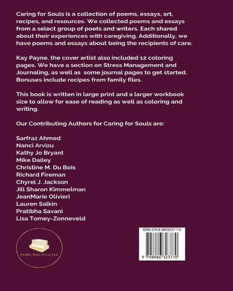 Caring for Souls is a collection of poems, essays, art, recipes, and resources. We collected poems and essays from a select group of poets and writers. Each shared about their experiences with caregiving. Additionally, we have poems and essays about being the recipients of care. Kay Payne, the cover artist also included 12 coloring pages. We have a section on Stress Management and Journaling, as well as some journal pages to get started. Bonuses include recipes from family files. This book is written in large print and a larger workbook size to allow for ease of reading as well as coloring and writing. When I embarked on this project, it was going to be solo. For some time, I have been in various care roles, as a giver and receiver. One thing I learned is that there is nothing you can do without others. This is why I decided it would be more beneficial to open up this book to other writers. It all began with an appeal or call to others where I ran a contest. The requirements were that each writer had to speak from their own experience, so no stories of fiction or telling somebody else's truths. There were several entries and I had no limits set as to how many I would choose. I simply went with the best of the entries which met the criteria. There are also some who have been invited because I saw something they shared and I wanted that in this book. These writers have dug deep into their souls to express their honesty about these experiences. I found it important to keep tissues handy while reading these heartful words. Those who know me, know I do not cry easily. Nonetheless, I found myself to become frequently choked up. I say this to offer a trigger warning that there are many deeply emotional stories within these writings. Beyond the writing, it is also important to explore our own stories. This opportunity is provided with the journal pages which are placed after the expressions. It has been found that when caregivers and receivers are in their spaces, creativity in various art forms can be beneficial. We have been fortunate to have the renderings of our cover artist Kay Payne also within the covers of this book. She has created several coloring pages which may be just what is needed for soothing. There are even some family recipes. Resources for care are plentiful but can be time-consuming to locate and determine the feasibility. We have provided a simple, not likely exhaustive resource list as the last portion of this book. After this, there are additional pages to jot down other information as you find it helpful. Thank you for taking the time to read these many thoughtful offerings and may your journey be one warmed in knowing that you are never alone.