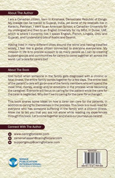 About the Book - God forbid when someone in the family gets diagnosed with a chronic or fatal illness, the entire family comes together for a few days. The entire load of the patient's care will go on one of the family members who will spend the most time, money, energy and/or emotions in the process while becoming the caregiver. Everyone will focus on caring for the patient while the care for the carer is neglected. Why don't we try caring for the carer for a change? This book shares some ideas on how a carer can care for the patients, in addition to caring for themselves in the process. This book is a must-read for everyone who has someone suffering in the family with a chronic illness. Allow me to tell you that you are not alone while reading my experiences through this book. Let's come together and share our journeys as carers! About the Author - I am a Canadian citizen, born in Kinshasa, Democratic Republic of Congo. My lineage can be traced to Gujarat, India, yet some of my relatives live in Karachi, Pakistan. I went to an American School, a Canadian University for my undergrad and then to an English University for my MEd, in Dubai, UAE, which is where I currently live. I speak English, French, Lingala, Urdu and Gujarati, and I understand bits of Arabic and Swahili. Having lived in many different cities around the world and having travelled widely, I feel like a global citizen connected to everyone everywhere. My mission in life is to provide support to as many people as I can by creating support groups and communities for carers to come together all across the world. Let's care for carers too!