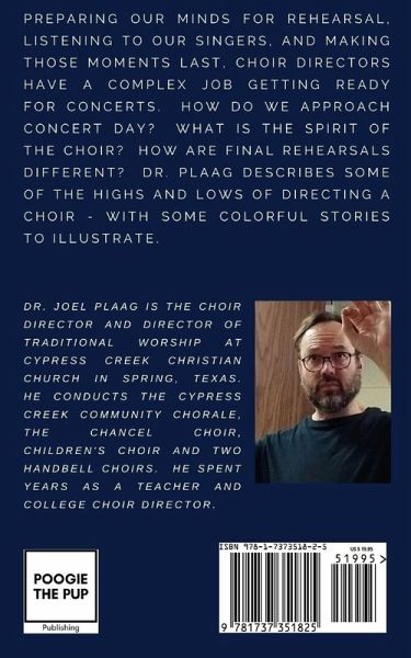 Preparing our minds for rehearsal, listening to our singers, and making those moments last, choir directors have a complex job getting ready for concerts. How do we approach concert day? What is the spirit of the choir? How are final rehearsals different? In this newest book of the I'm a Choir Director series, Dr. Plaag describes some of the highs and lows of directing a choir - with a few colorful stories to illustrate.