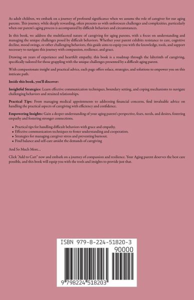 As adult children, we embark on a journey of profound significance when we assume the role of caregiver for our aging parents. This journey, while deeply rewarding, often presents us with unforeseen challenges and complexities, particularly when our parent's aging process is accompanied by difficult behaviors and circumstances. In this book, we address the multifaceted nature of caregiving for aging parents, with a focus on understanding and managing the unique challenges posed by difficult behaviors. Whether your parent exhibits resistance to care, cognitive decline, mood swings, or other challenging behaviors, this guide aims to equip you with the knowledge, tools, and support necessary to navigate this journey with compassion, resilience, and grace. Drawing on years of experience and heartfelt empathy, this book is a roadmap through the labyrinth of caregiving, specifically tailored for those grappling with the unique challenges presented by a difficult aging parent. With compassionate insight and practical advice, each page offers solace, strategies, and solutions to empower you on this intricate path. Inside this book, you'll discover: Insightful Strategies: Learn effective communication techniques, boundary setting, and coping mechanisms to navigate challenging behaviors and strained relationships. Practical Tips: From managing medical appointments to addressing financial concerns, find invaluable advice on handling the practical aspects of caregiving with efficiency and confidence. Empowering Insights: Gain a deeper understanding of your aging parent's perspective, fears, needs, and desires, fostering empathy and fostering stronger connections.Practical tips for handling difficult behaviors with grace and empathy. Effective communication techniques to foster understanding and cooperation. Strategies for managing caregiver stress and preventing burnout. Find balance and self-care amidst the demands of caregiving And So Much More... Click "Add to Cart" now and embark on a journey of compassion and resilience. Your Aging parent deserves the best care possible, and this book will equip you with the tools and insights to provide just that.