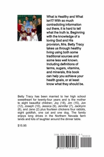 What is Healthy and What isn't? With so much contradicting information out there, it is hard to tell what the truth is. Beginning with the knowledge of a loving God and His provision, Mrs. Betty Tracy takes us through healthy living using both some traditional sources and some less well known. Including definitions of terms, sugars, vitamins, and minerals, this book can help you achieve your health goals, or at least know what they should be. By Betty Sue Tracy