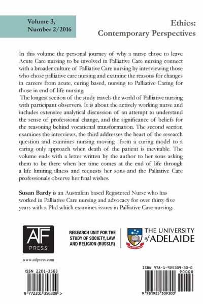 In this volume the personal journey of why a nurse chose to leave Acute Care nursing to be involved in Palliative Care nursing connect with a broader culture of Palliative Care nursing by interviewing those who chose palliative care nursing and examine the reasons for changes in careers from acute, curing based, nursing to Palliative Caring for those in end of life nursing. The longest section of the study travels the world of Palliative nursing with participant observers. It is about the actively working nurse and includes extensive analytical discussion of an attempt to understand the sense of professional change, and the significance of beliefs for the reasoning behind vocational transformation. The second section examines the interviews, the third addresses the heart of the research question and examines nursing moving from a curing model to a caring only approach when death of the patient is inevitable. The volume ends with a letter written by the author to her sons asking them to be there when her time comes at the end of life through a life limiting illness and requests her sons and the Palliative Care professionals observe her final wishes.