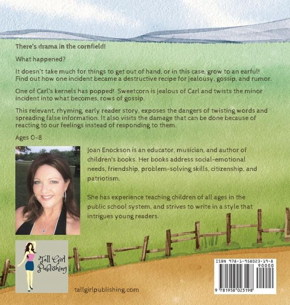 There's drama in the cornfield! What happened? It doesn't take much for things to get out of hand, or in this case, grow to an earful! Find out how one incident became a destructive recipe for jealousy, gossip, and rumor. One of Carl's kernels has popped! Sweetcorn is jealous of Carl and twists the minor incident into what becomes, rows of gossip. This relevant, rhyming, early reader story, exposes the dangers of twisting words and spreading false information. It also visits the damage that can be done because of reacting to our feelings instead of responding to them.