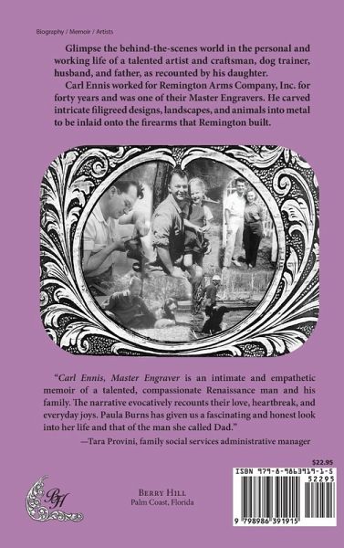 Glimpse the behind-the-scenes world in the personal and working life of a talented artist and craftsman, dog trainer, husband, and father, as recounted by his daughter. Carl Ennis, worked for Remington Arms Company, Inc. for forty years and was one of their Master Engravers. He carved intricate filigreed designs, landscapes, and animals onto metal to be inlaid onto the firearms that Remington built.