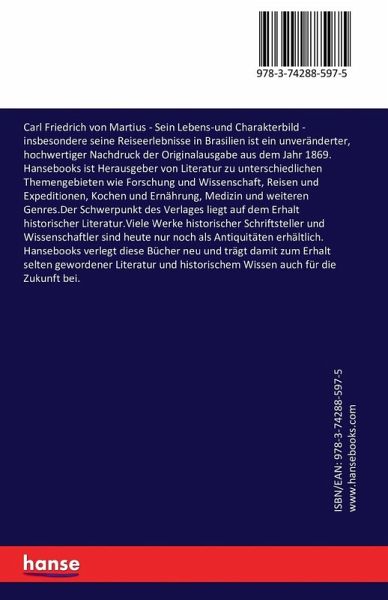 Carl Friedrich von Martius - Sein Lebens-und Charakterbild - insbesondere seine Reiseerlebnisse in Brasilien ist ein unveränderter, hochwertiger Nachdruck der Originalausgabe aus dem Jahr 1869.Hansebooks ist Herausgeber von Literatur zu unterschiedlichen Themengebieten wie Forschung und Wissenschaft, Reisen und Expeditionen, Kochen und Ernährung, Medizin und weiteren Genres.Der Schwerpunkt des Verlages liegt auf dem Erhalt historischer Literatur.Viele Werke historischer Schriftsteller und Wissenschaftler sind heute nur noch als Antiquitäten erhältlich. Hansebooks verlegt diese Bücher neu und trägt damit zum Erhalt selten gewordener Literatur und historischem Wissen auch für die Zukunft bei.