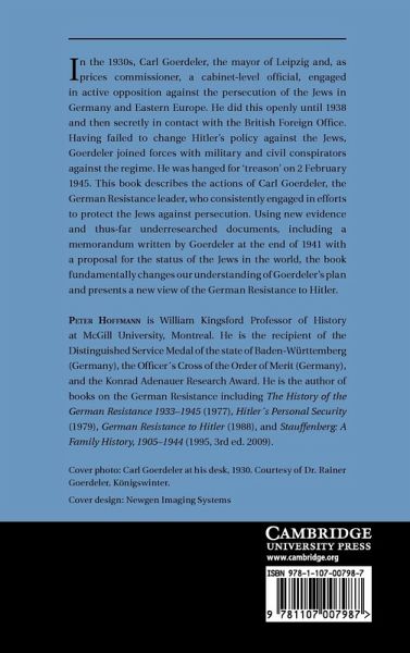 In the 1930s, Carl Goerdeler, the mayor of Leipzig and, as prices commissioner, a cabinet-level official, engaged in active opposition against the persecution of the Jews in Germany and in Eastern Europe. He did this openly until 1938 and then secretly in contact with the British Foreign Office. Having failed to change Hitler's policy against the Jews, Goerdeler joined forces with military and civil conspirators against the regime. He was hanged for treason on 2 February 1945. This book describes the actions of Carl Goerdeler, the German resistance leader who consistently engaged in efforts to protect the Jews against persecution. Using new evidence and thus far under-researched documents, including a memorandum written by Goerdeler at the end of 1941 with a proposal for the status of the Jews in the world, the book fundamentally changes our understanding of Goerdeler's plan and presents a new view of the German resistance to Hitler.