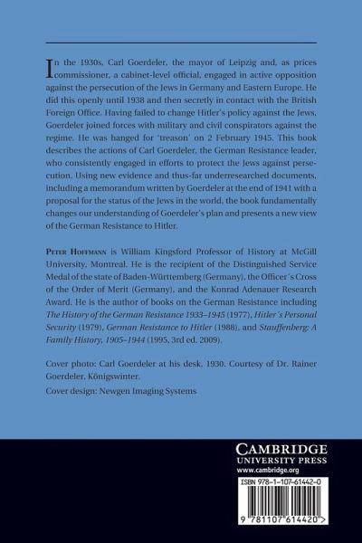 In the 1930s, Carl Goerdeler, the mayor of Leipzig and, as prices commissioner, a cabinet-level official, engaged in active opposition against the persecution of the Jews in Germany and in Eastern Europe. He did this openly until 1938 and then secretly in contact with the British Foreign Office. Having failed to change Hitler's policy against the Jews, Goerdeler joined forces with military and civil conspirators against the regime. He was hanged for treason on 2 February 1945. This book describes the actions of Carl Goerdeler, the German resistance leader who consistently engaged in efforts to protect the Jews against persecution. Using new evidence and thus far under-researched documents, including a memorandum written by Goerdeler at the end of 1941 with a proposal for the status of the Jews in the world, the book fundamentally changes our understanding of Goerdeler's plan and presents a new view of the German resistance to Hitler.