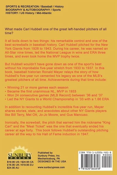 What made Carl Hubbell one of the great left-handed pitchers of all time? It all boils down to two things: his remarkable control and one of the best screwballs in baseball history. Carl Hubbell pitched for the New York Giants from 1928 to 1943. During his career, he was named an All-Star nine times, led the National League in wins and ERA three times, and even took home the MVP trophy twice. But Hubbell wouldn't have gone down as one of the sport's best without his improbable five-year stretch from 1933-1937. In this book, baseball historian Ronald Mayer relays the story of how Hubbell's five-year run cemented his legacy as one of the MLB's greatest pitchers of all time. Achievements during that time include:Winning 21 or more games each season Became the first unanimous NL, MVP in 1933 Won 24 consecutive games (MLB Record) between '36 and '37 Led the NY Giants to a World Championship in '33 with a 1.66 ERA In addition to recounting Hubbell's incredible five-year run, Mayer shares stories, stats, and anecdotes about other NY Giants players like Bill Terry, Mel Ott, Jo-Jo- Moore, and Gus Mancuso. Ironically, the screwball, the pitch that earned him the nickname "King Carl" and the "Meal Ticket" was the one that eventually ended his career at age forty. This book follows Hubbell's outstanding pitching career all the way to his Hall of Fame induction in 1947.