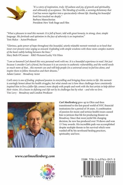 Carl Moellenberg's story is one of overcoming enormous obstacles and changing course to find his passion and his true self to live joyously as a long-term survivor. It is a journey of many transformations: from Midwestern boy most interested in music to a fast-paced Wall Street career; from investment banking to a 13-time Tony Award-winner on Broadway; from overcoming several death-defying crises by finding healing, and inspiration from a higher being, and deeper spirituality. Carl hopes that his story will inspire others who face seemingly overwhelming obstacles to find their passion, their reason to live, and to find love.