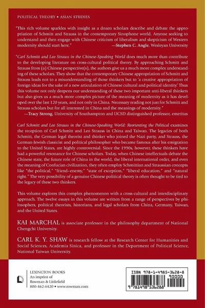 Chapter 1 Three Strategies for Criticizing Liberalism and Their Continued Relevance Chapter 2 Toward a Radical Critique of Liberalism: Carl Schmitt and Leo Strauss in Contemporary Chinese Discourses Chapter 3 From "Carl Schmitt on Mao" to "Carl Schmitt in China": Unsettled Issues and Unsettling Continuities Chapter 4 The Tyranny of Values: Reflections on Schmitt and China Chapter 5 Reading the Temperature Curve: Sinophone Schmitt-Fever in Context and Perspective Chapter 6 Carl Schmitt Redux: Law and the Political in Contemporary Global Constitutionalism Chapter 7 Carl Schmitt in Taiwanese Constitutional Law: An Incomplete Reception of Schmitt's Constitutional Theory Chapter 8 Leo Strauss's Critique of the Political in a Sinophone Context Chapter 9 Modernity, Tyranny, and Crisis: Leo Strauss in China Chapter 10 On Leo Strauss as Negative Philosopher Chapter 11 Mirror or Prism for Chinese Modernity? A Reading of Leo Strauss Chapter 12 Toward a Taiwanese Cultural Renaissance: A Straussian Perspective