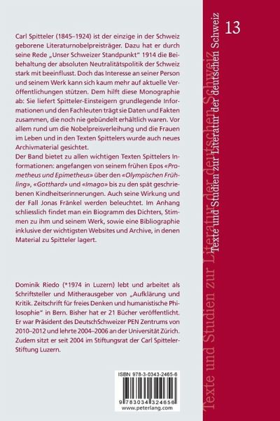 Carl Spitteler (1845-1924) ist der einzige in der Schweiz geborene Literaturnobelpreisträger. Dazu hat er durch seine Rede «Unser Schweizer Standpunkt» 1914 die Beibehaltung der absoluten Neutralitätspolitik der Schweiz stark mit beeinflusst. Doch das Interesse an seiner Person und seinem Werk kann sich kaum mehr auf aktuelle Veröffentlichungen stützen. Dem hilft diese Monographie ab: Sie liefert Spitteler-Einsteigern grundlegende Informationen und den Fachleuten trägt sie Daten und Fakten zusammen, die noch nie gebündelt erhältlich waren. Vor allem rund um die Nobelpreisverleihung und die Frauen im Leben und in den Texten Spittelers wurde auch neues Archivmaterial gesichtet.