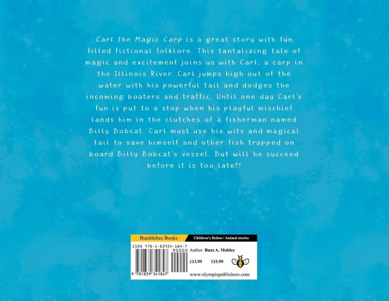 Carl the Magic Carp is a great story with fun filled fictional folklore. This tantalizing tale of magic and excitement joins us with Carl, a carp in the Illinois River. Carl jumps high out of the water with his powerful tail and dodges the incoming boaters and traffic. Until one day Carl's fun is put to a stop when his playful mischief lands him in the clutches of a fisherman named Billy Bobcat. Carl must use his wits and magical tail to save himself and other fish trapped on board Billy Bobcat's vessel. But will he succeed before it is too late?!