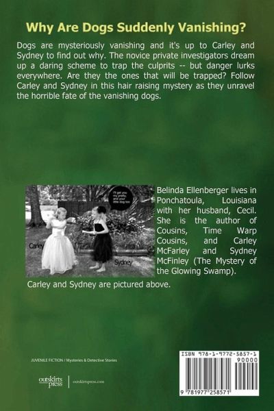 Why are dogs vanishing? A little girl shows up at Carley's house. She is extremely distraught that her black labradoodle is missing and hires Carley and Sydney to find her dog. While investigating they discover that dogs all over town are vanishing. It's up to them to find out why. The novice private investigators dream up a daring scheme to trap the culprits. Their investigation takes a detour when they try to break their aunt out of an insane asylum. Danger lurks everywhere. Are they the ones that will be trapped. Follow Carley and Sydney in this hair-rising mystery as they unravel the horrible fate of the vanishing dogs.
