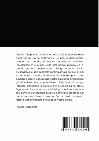 "Siamo intrappolati all'interno della bolla di percezione e quello di cui siamo testimoni è un riflesso della nostra visione del mondo, la nostra descrizione. Parliamo incessantemente a noi stessi del nostro mondo ed è proprio grazie a questo nostro dialogo interiore che lo preserviamo, e ogniqualvolta continuiamo a parlarci di noi e del nostro mondo, il mondo rimane sempre come dovrebbe essere. Con questo nostro dialogo lo rinnoviamo, gli infondiamo vita, lo puntelliamo. Arrestando il dialogo interiore, sfondiamo la barriera che ci separa da noi stessi. Ogni volta che si interrompe il dialogo interiore, il mondo così come lo conosciamo collassa e affiorano aspetti di noi del tutto straordinari, come se fino a quel momento fossero stati sorvegliati a vista dalle nostre parole." - Carlos Castaneda