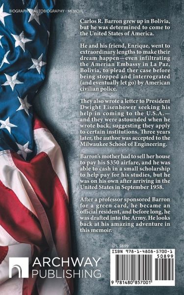 Carlos R. Barron grew up in Bolivia, but he was determined to come to the United States of America. He and his friend, Enrique, went to extraordinary lengths to make their dream happeneven infiltrating the Amerian Embassy in La Paz, Bolivia, to plead ther case before being stopped and interrogated (and eventually let go) by American civilian police. They also wrote a letter to President Dwight Eisenhower seeking his help in coming to the U.S.A. and they were astounded when he wrote back, suggesting they apply to certain institutions. three years later, the author was accepted to the Milwaukee School of Engineering. Barrons mother had to sell her house to pay his $350 airfare, and he was able to cash in a small scholarship to help pay for his studies, but he was on his own after arriving in the United States in September 1958. After a professor sponsored Barron for a green card, he became an official resident, and before long, he was drafted into the Army. He looks back at his amazing adventure in this memoir.