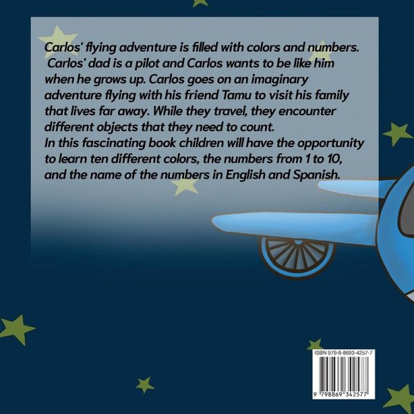 Carlos' flying adventure is filled with colors and numbers. Carlos' dad is a pilot and Carlos wants to be like him when he grows up. Carlos goes on an imaginary adventure flying with his friend Tamu to visit his family that lives far away. While they travel, they encounter different objects that they need to count. In this fascinating book children will have the opportunity to learn ten different colors, the numbers from 1 to 10, and also the numbers in words in English and Spanish.