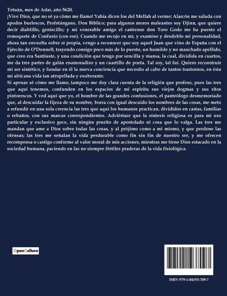 Tetuán, mes de Adar, año 5620. ¡Vive Dios, que no sé ya cómo me llamo! Yahia dicen los del Mellah al verme; Alarcón me saluda con apodos burlescos, Profetángano, Don Bíblico; para algunos moros maleantes soy Djinn, que quiere decir diablillo, geniecillo; y mi venerable amigo el castrense don Toro Godo me ha puesto el remoquete de Confusio (con ese). Cuando me recojo en mí, y examino y desdoblo mi personalidad, ahora tan envuelta sobre sí propia, vengo a reconocer que soy aquel Juan que vino de España con el Ejército de O'Donnell, trayendo consigo poco más de lo puesto, un humilde y no manchado apellido, que creo era Santiuste, y una condición que tengo por sencilla y mansa, la cual, dividida en cuartos, me da tres partes de galán enamoradizo y un cuartillo de poeta. Tal soy, tal fui. Quiero reconstruir mi ser sintético, y fundar en él la nueva conciencia que necesito al cabo de tantos trastornos, en ésta mi africana vida tan atropellada y exuberante. Si apenas sé cómo me llamo, tampoco me doy clara cuenta de la religión que profeso, pues las tres que aquí tenemos, confunden en los espacios de mi espíritu sus viejos dogmas y sus ritos pintorescos. Y ved aquí que yo, el hombre de las grandes confusiones, el panteólogo desmemoriado que, al descuidar la fijeza de su nombre, borra con igual descuido los nombres de las cosas, me meto a refundir en una sola creencia las tres que aquí los humanos practican, divididos en castas, familias o rebaños, con sus marcas correspondientes. Adviértase que la síntesis religiosa es para mi uso particular y exclusivo goce, sin ningún prurito de apostolado ni cosa que lo valga. Las tres me mandan que ame a Dios sobre todas las cosas, y al prójimo como a mí mismo, y que perdone las ofensas; las tres me señalan la vida perdurable como fin sin fin de nuestro ser, y me ofrecen recompensa o castigo conforme al valor moral de mis acciones, mientras me tiene Dios estacado en la sociedad humana, paciendo en las no siempre fértiles praderas de la vida fisiológica.