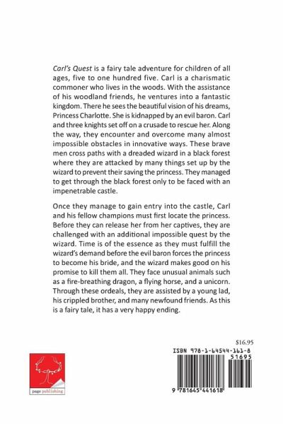 Carl's Quest is a fairy tale adventure for children of all ages, five to one hundred five. Carl is a charismatic commoner who lives in the woods. With the assistance of his woodland friends, he ventures into a fantastic kingdom. There he sees the beautiful vision of his dreams, Princess Charlotte. She is kidnapped by an evil baron. Carl and three knights set off on a crusade to rescue her. Along the way, they encounter and overcome many almost impossible obstacles in innovative ways. These brave men cross paths with a dreaded wizard in a black forest where they are attacked by many things set up by the wizard to prevent their saving the princess. They managed to get through the black forest only to be faced with an impenetrable castle. Once they manage to gain entry into the castle, Carl and his fellow champions must first locate the princess. Before they can release her from her captives, they are challenged with an additional impossible quest by the wizard. Time is of the essence as they must fulfill the wizard's demand before the evil baron forces the princess to become his bride, and the wizard makes good on his promise to kill them all. They face unusual animals such as a fire-breathing dragon, a flying horse, and a unicorn. Through these ordeals, they are assisted by a young lad, his crippled brother, and many newfound friends. As this is a fairy tale, it has a very happy ending. 2