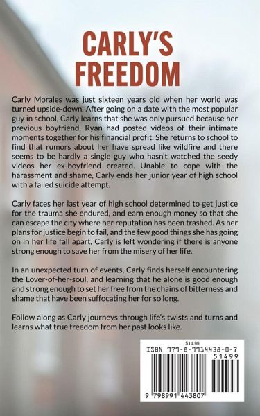 Carly Morales was just sixteen years old when her world was turned upside-down. After going on a date with the most popular guy in school, Carly learns that she was only pursued because her previous boyfriend, Ryan had posted videos of their intimate moments together for his financial profit. She returns to school to find that rumors about her have spread like wildfire and there seems to be hardly a single guy who hasn't watched the seedy videos her ex-boyfriend created. Unable to cope with the harassment and shame, Carly ends her junior year of high school with a failed suicide attempt. Carly faces her last year of high school determined to get justice for the trauma she endured, and earn enough money so that she can escape the city where her reputation has been trashed. As her plans for justice begin to fail, and the few good things she has going on in her life fall apart, Carly is left wondering if there is anyone strong enough to save her from the misery of her life. In an unexpected turn of events, Carly finds herself encountering the Lover-of-her-soul, and learning that he alone is good enough and strong enough to set her free from the chains of bitterness and shame that have been suffocating her for so long. Follow along as Carly journeys through life's twists and turns and learns what true freedom from her past looks like.